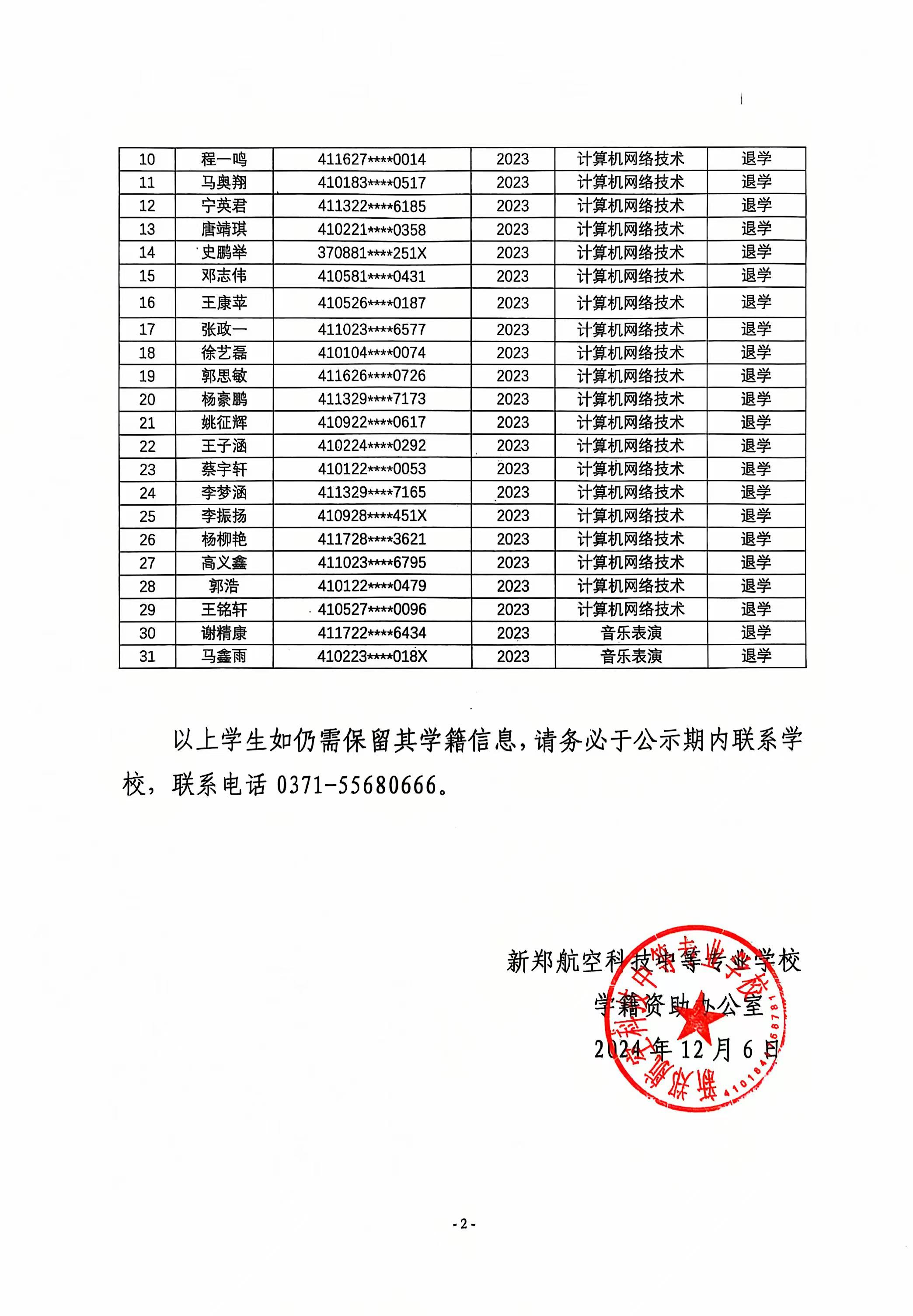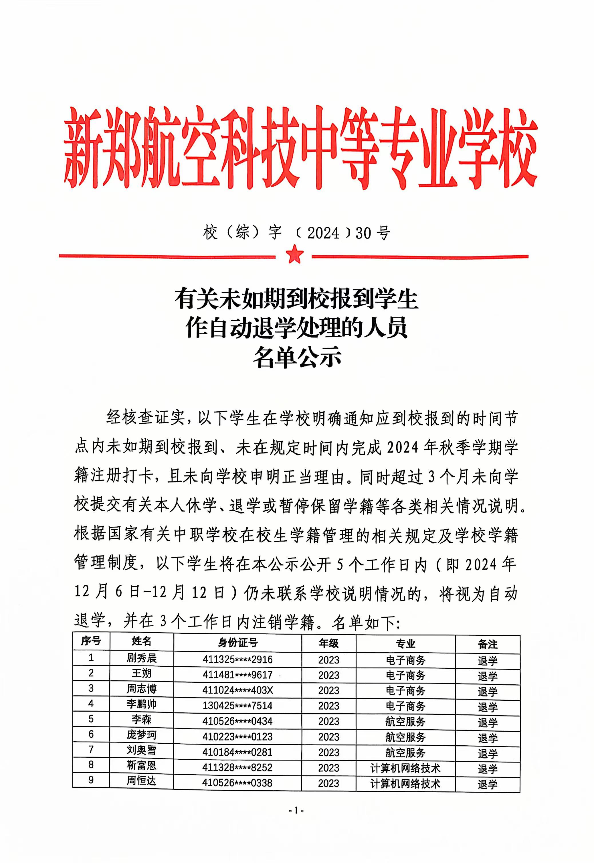 有关未如期到校报到学生作自动退学处理的人员名单公示